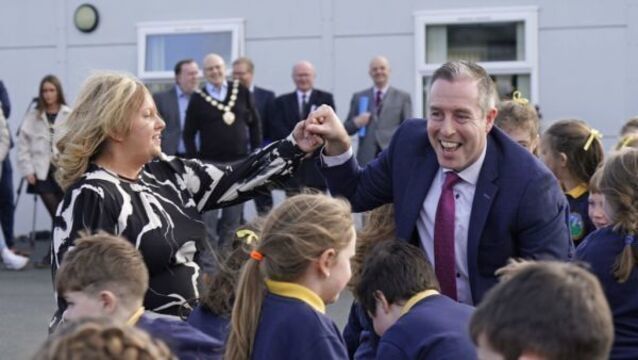 Paul Givan, fear lasta tinte cnámh tráth dá raibh, fear a chiorraigh caoga míle punt ó Liofa thiar sa lá, ag tabhairt cuairt ar ghaelscoil.