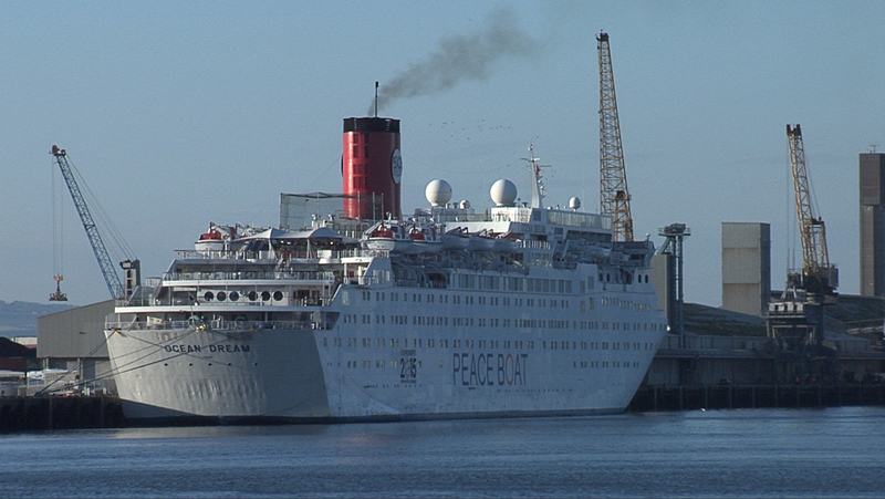 Thug an bád síochána ‘Peace Boat’ cuairt aon lae ar Bhéal Feirste le linn a mhuiraistir dhomhanda.