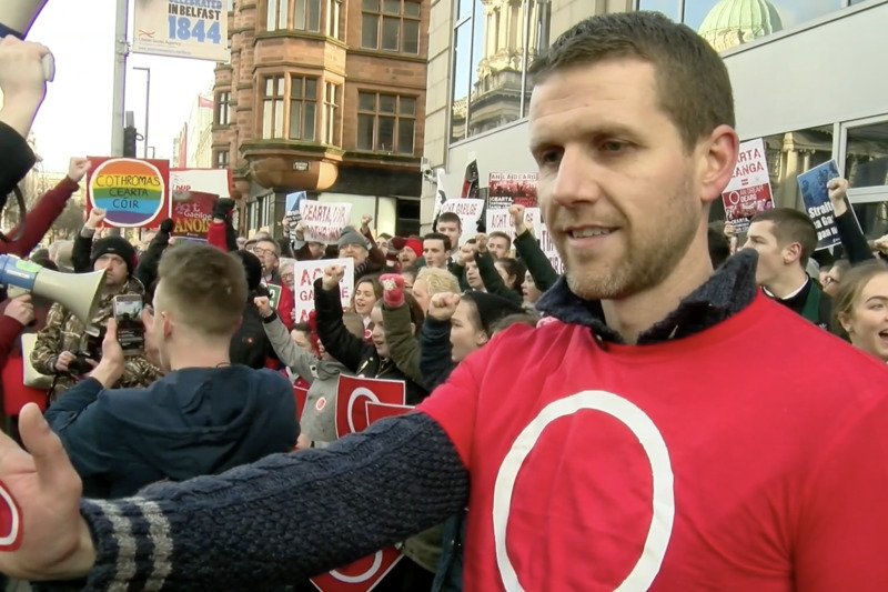 Léirsiú faoin easpa comharthaí Gaeilge ag Mórstáisiún Bhéal Feirste
