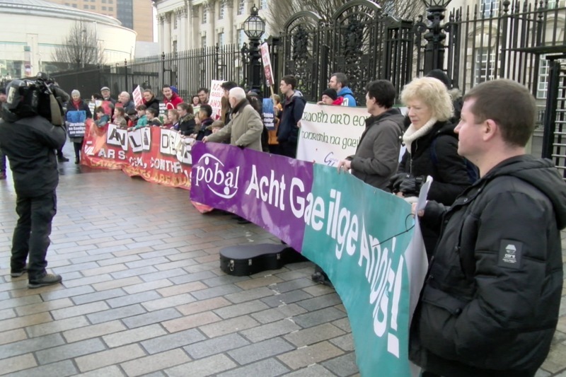 Léirsiú ar son comharthaíocht dhátheangach ag Ollscoil na Banríona